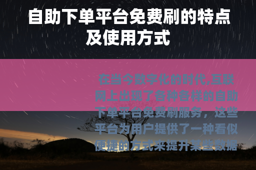 在当今数字化的时代,互联网上出现了各种各样的自助下单平台免费刷服务,这些平台为用户提供了一种看似便捷的方式来提升某些数据指标,在一定程度上满足了部分用户对于快速增长和曝光的需求。