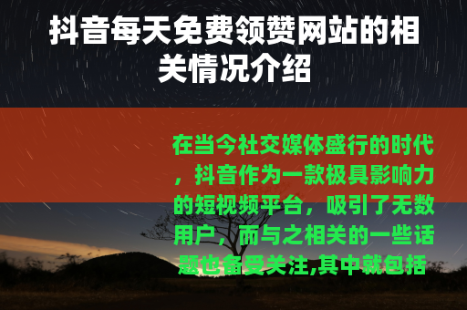 在当今社交媒体盛行的时代,抖音作为一款极具影响力的短视频平台,吸引了无数用户,而与之相关的一些话题也备受关注,其中就包括抖音每天免费领赞网站。