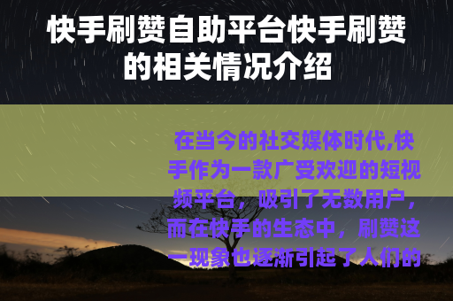 在当今的社交媒体时代,快手作为一款广受欢迎的短视频平台,吸引了无数用户,而在快手的生态中,刷赞这一现象也逐渐引起了人们的关注,其中快手刷赞自助平台更是成为了一个热门话题。
