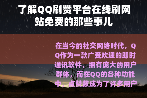 在当今的社交网络时代,QQ作为一款广受欢迎的即时通讯软件,拥有庞大的用户群体,而在QQ的各种功能中,点赞数成为了许多用户关注的一个重要指标,它在一定程度上代表着个人的人气和受欢迎程度,QQ刷赞平台在线刷网站免费这样的服务便应运而生,吸引了不少人的目光。