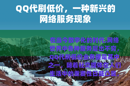 在当今数字化的时代,网络世界中各种服务层出不穷,QQ代刷低价业务便是其中之一,随着社交媒体在人们生活中的重要性日益凸显,QQ作为一款拥有庞大用户群体的社交软件,与之相关的各类服务也应运而生,QQ代刷低价业务就是在这样的背景下逐渐走进了大众的视野。