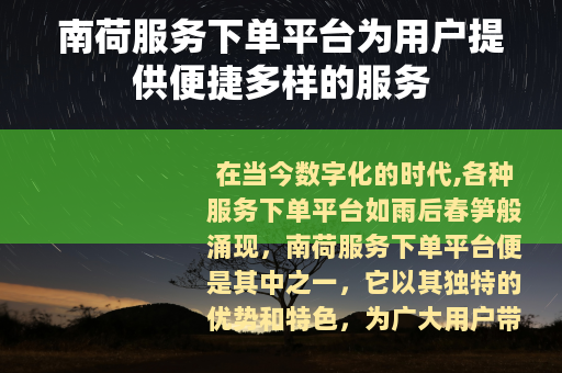 在当今数字化的时代,各种服务下单平台如雨后春笋般涌现,南荷服务下单平台便是其中之一,它以其独特的优势和特色,为广大用户带来了诸多便利和价值。