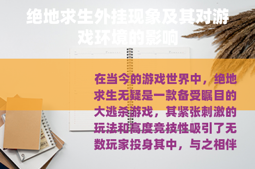 在当今的游戏世界中,绝地求生无疑是一款备受瞩目的大逃杀游戏,其紧张刺激的玩法和高度竞技性吸引了无数玩家投身其中,与之相伴的一个问题也日益凸显,那就是绝地求生外挂的存在。