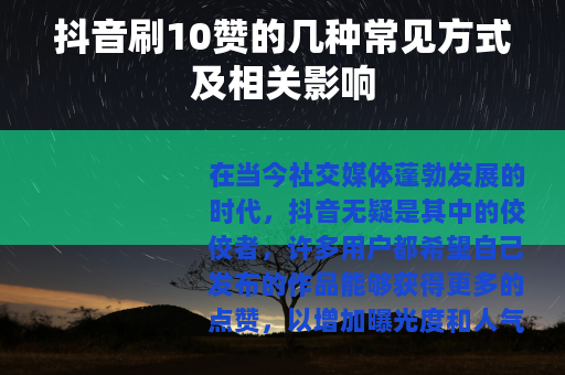 在当今社交媒体蓬勃发展的时代,抖音无疑是其中的佼佼者,许多用户都希望自己发布的作品能够获得更多的点赞,以增加曝光度和人气,抖音刷10赞这样的需求也在一定程度上存在着。