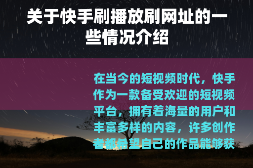 在当今的短视频时代,快手作为一款备受欢迎的短视频平台,拥有着海量的用户和丰富多样的内容,许多创作者都希望自己的作品能够获得更多的播放量,从而提高知名度和影响力,在这种需求下,一些所谓的快手刷播放刷网址的信息开始在网络上出现。