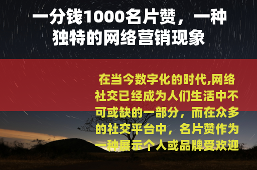 “一分钱1000名片赞”作为一种独特的网络营销现象,在当前的网络社交中具有一定的影响力和意义,它为人们提供了一种快速提升名片赞数量的途径,同时也引发了人们对于社交价值和真实性的思考,在合理利用这种服务的同时,我们也应该保持理性和清醒,注重自身的发展和成长,以在网络社交中获得真正的认可和成功。