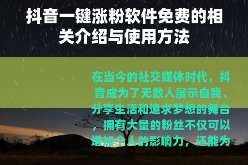 在当今的社交媒体时代,抖音成为了无数人展示自我、分享生活和追求梦想的舞台,拥有大量的粉丝不仅可以增加个人的影响力,还能为创作者带来更多的机会和收益,很多人都在寻找有效的涨粉方法,而抖音一键涨粉软件免费的出现,引起了众多用户的关注。