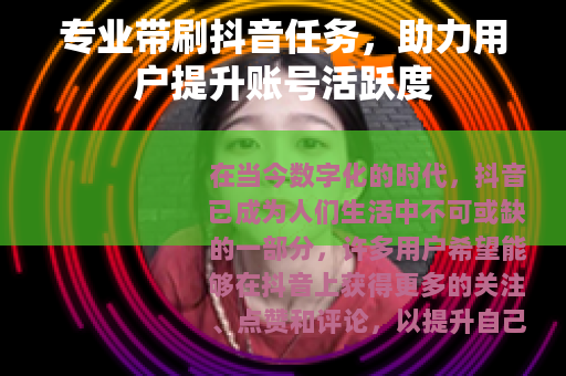 在当今数字化的时代,抖音已成为人们生活中不可或缺的一部分,许多用户希望能够在抖音上获得更多的关注、点赞和评论,以提升自己账号的活跃度和影响力,而专业带刷抖音任务的服务便应运而生,为广大用户提供了一种有效的解决方案。