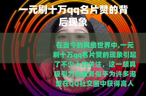 在当今的网络世界中,一元刷十万qq名片赞的现象引起了不少人的关注,这一颇具吸引力的服务似乎为许多渴望在QQ社交圈中获得高人气的用户提供了一条捷径。