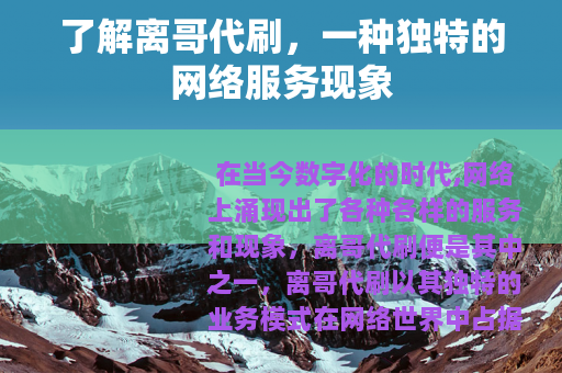 在当今数字化的时代,网络上涌现出了各种各样的服务和现象,离哥代刷便是其中之一,离哥代刷以其独特的业务模式在网络世界中占据了一席之地,吸引了众多用户的关注。