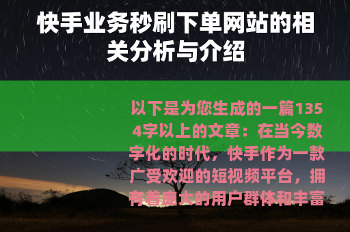 在当今数字化的时代,快手作为一款广受欢迎的短视频平台,拥有着庞大的用户群体和丰富多样的内容生态,与之相关的各种业务也应运而生,其中快手业务秒刷下单网站便成为了一个备受关注的话题。