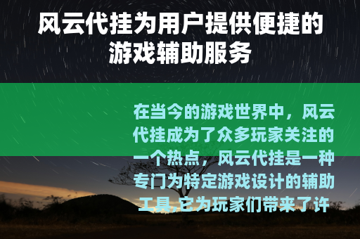 在当今的游戏世界中,风云代挂成为了众多玩家关注的一个热点,风云代挂是一种专门为特定游戏设计的辅助工具,它为玩家们带来了许多独特的便利和体验。