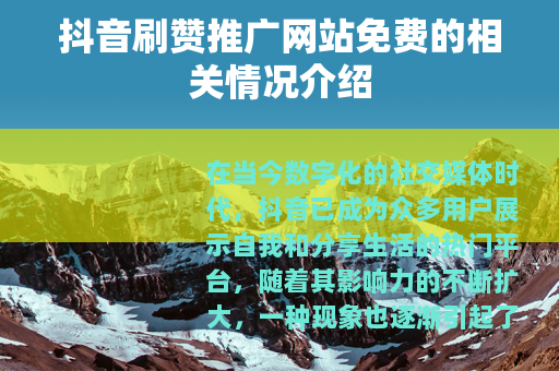 在当今数字化的社交媒体时代,抖音已成为众多用户展示自我和分享生活的热门平台,随着其影响力的不断扩大,一种现象也逐渐引起了人们的关注,那就是抖音刷赞推广网站免费的存在。