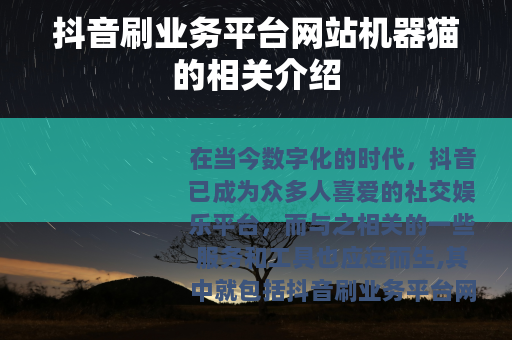 在当今数字化的时代,抖音已成为众多人喜爱的社交娱乐平台,而与之相关的一些服务和工具也应运而生,其中就包括抖音刷业务平台网站机器猫。