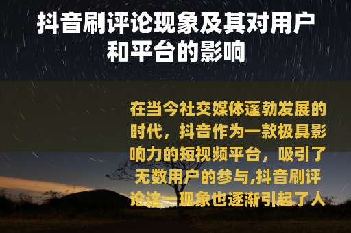 在当今社交媒体蓬勃发展的时代,抖音作为一款极具影响力的短视频平台,吸引了无数用户的参与,抖音刷评论这一现象也逐渐引起了人们的关注。