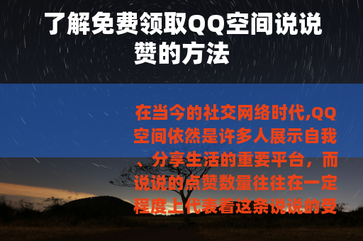 在当今的社交网络时代,QQ空间依然是许多人展示自我、分享生活的重要平台,而说说的点赞数量往往在一定程度上代表着这条说说的受欢迎程度和影响力,很多人都希望能够获得更多的QQ空间说说赞,以增加自己在社交平台上的关注度和人气,我们就来聊一聊关于免费领取QQ空间说说赞的那些事儿。