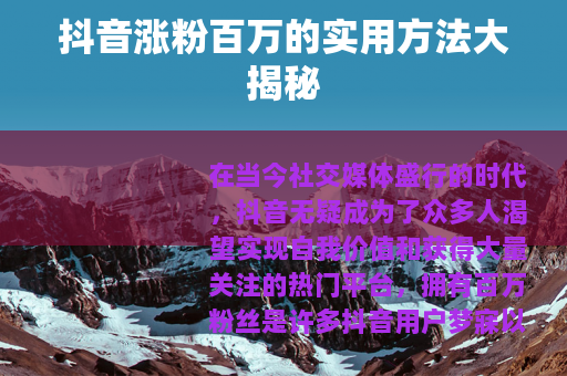 要在抖音上涨到百万粉丝并非一蹴而就的事情,需要持续的努力和耐心,不断学习和改进自己的视频创作技巧,积极运用各种涨粉策略,相信在不久的将来,你也能在抖音上实现百万粉丝的梦想,收获属于自己的成功和荣耀。 对你在抖音涨粉的道路上有所帮助,让你离百万粉丝的目标越来越近。