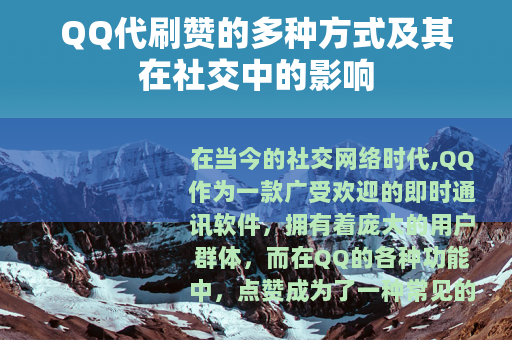 在当今的社交网络时代,QQ作为一款广受欢迎的即时通讯软件,拥有着庞大的用户群体,而在QQ的各种功能中,点赞成为了一种常见的社交互动方式,许多用户希望自己发布的动态、说说等能获得更多的赞,以展示自己的人气和魅力,于是QQ代刷赞的现象应运而生。