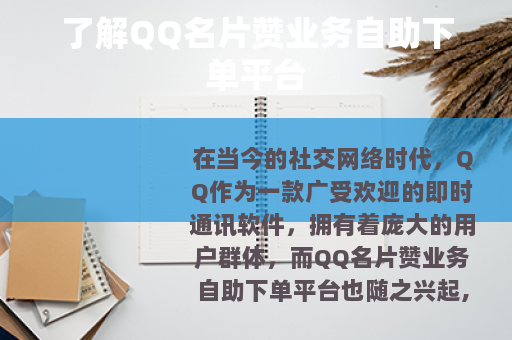 在当今的社交网络时代,QQ作为一款广受欢迎的即时通讯软件,拥有着庞大的用户群体,而QQ名片赞业务自助下单平台也随之兴起,为许多用户提供了一种提升自己QQ名片点赞数的途径。