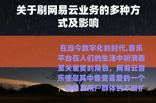 在当今数字化的时代,音乐平台在人们的生活中扮演着至关重要的角色,网易云音乐便是其中备受喜爱的一个,随着其用户群体的不断扩大,与之相关的刷业务现象也逐渐引起了人们的关注。