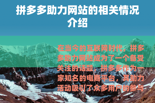 在当今的互联网时代,拼多多助力网站成为了一个备受关注的话题,拼多多作为一家知名的电商平台,其助力活动吸引了众多用户的参与,而与之相关的助力网站也应运而生。