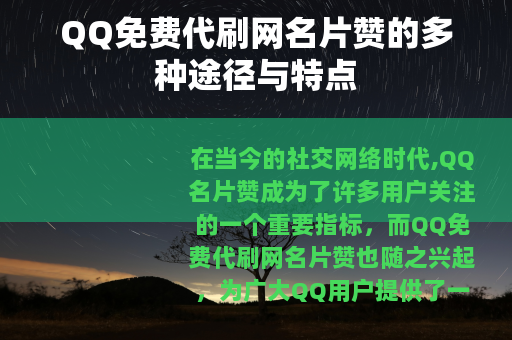 在竞争激烈的社交网络环境中,QQ免费代刷网名片赞为用户提供了一种提升自己社交价值的途径,它让那些在现实生活中可能不太善于社交或者在QQ平台上活跃度不高的用户,也有机会获得较高的名片赞数,从而在虚拟的社交世界中获得更多的自信和满足感,对于一些希望通过QQ拓展人脉、提升个人品牌形象的用户来说,较多的名片赞也可以作为一种吸引力,吸引更多的人主动添加好友,进一步扩大自己的社交圈子。