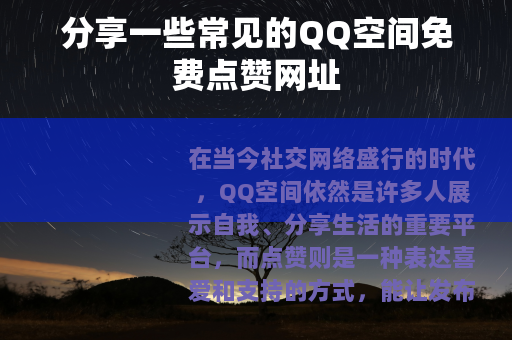 QQ空间免费点赞网址为用户提供了一种方便快捷的方式来增加自己空间的点赞数,让用户在社交网络中能够更好地展现自己,只要合理使用,就能为我们的QQ空间体验带来更多的乐趣和价值。