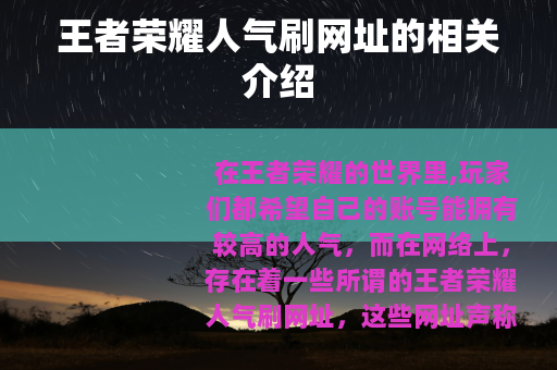 王者荣耀人气刷网址在游戏玩家群体中是一个存在争议但又有一定需求的事物,玩家们在面对这些网址时,要理性看待,权衡利弊,根据自己的实际情况和需求来决定是否要使用它们,同时也要始终牢记,在游戏中,真正的价值和快乐还是来自于自身的游戏体验和成长,而不是单纯的人气数字。