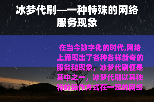 在当今数字化的时代,网络上涌现出了各种各样新奇的服务和现象,冰梦代刷便是其中之一,冰梦代刷以其独特的运作方式在一定的网络圈子里受到了关注。