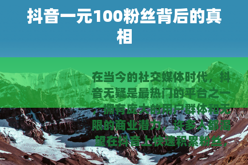 在当今的社交媒体时代,抖音无疑是最热门的平台之一,拥有庞大的用户群体和无限的商业潜力,许多人都渴望在抖音上快速积累粉丝,以提升自己的影响力和实现各种目标,而市场上也出现了一些声称可以一元购买100粉丝的服务,这看似极具吸引力的交易背后,究竟隐藏着怎样的秘密呢?