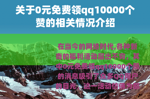 在当今的网络时代,各种新奇的福利活动层出不穷,其中0元免费领qq10000个赞的消息吸引了众多QQ用户的目光,这一活动仿佛为那些渴望在QQ空间等社交平台上获得更多关注和人气的用户带来了希望之光。