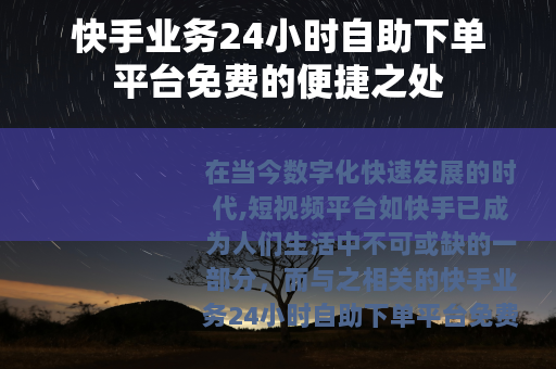 在当今数字化快速发展的时代,短视频平台如快手已成为人们生活中不可或缺的一部分,而与之相关的快手业务24小时自助下单平台免费也应运而生,为众多用户提供了一种全新的体验和便利。