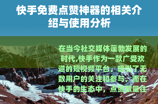 在当今社交媒体蓬勃发展的时代,快手作为一款广受欢迎的短视频平台,吸引了无数用户的关注和参与,而在快手的生态中,点赞数量往往被视为衡量一个视频受欢迎程度的重要指标之一,市场上出现了一些所谓的快手免费点赞神器,引起了不少用户的兴趣。