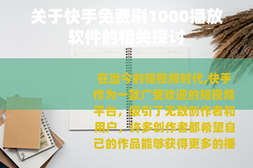 在当今的短视频时代,快手作为一款广受欢迎的短视频平台,吸引了无数创作者和用户,许多创作者都希望自己的作品能够获得更多的播放量,从而提升自己的知名度和影响力,在这种需求下,市场上出现了一些声称可以免费刷快手1000播放的软件。