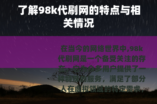 在当今的网络世界中,98k代刷网是一个备受关注的存在,它为众多用户提供了一种特殊的服务,满足了部分人在虚拟领域的特定需求。
