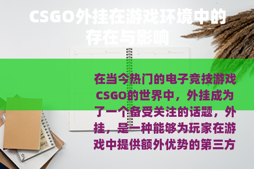 在当今热门的电子竞技游戏CSGO的世界中,外挂成为了一个备受关注的话题,外挂,是一种能够为玩家在游戏中提供额外优势的第三方软件或程序,它的出现,极大地改变了游戏的平衡性和竞技性,给众多玩家的游戏体验带来了复杂而深远的影响。