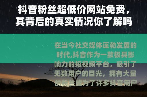 在当今社交媒体蓬勃发展的时代,抖音作为一款极具影响力的短视频平台,吸引了无数用户的目光,拥有大量的粉丝成为了许多抖音用户追求的目标,因为粉丝数量不仅代表着人气,还可能带来更多的机会和收益,在这种需求的推动下,抖音粉丝超低价网站免费的信息开始在网络上流传开来。