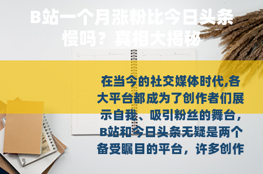 在当今的社交媒体时代,各大平台都成为了创作者们展示自我、吸引粉丝的舞台,B站和今日头条无疑是两个备受瞩目的平台,许多创作者在选择平台时,会考虑到涨粉的速度等因素,B站一个月涨粉比今日头条慢吗?这是一个备受关注且颇具争议的问题,今天我们就来深入探讨一下。