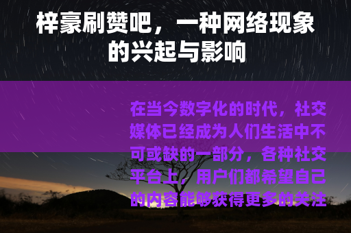 在当今数字化的时代,社交媒体已经成为人们生活中不可或缺的一部分,各种社交平台上,用户们都希望自己的内容能够获得更多的关注和点赞,以展示自己的影响力和受欢迎程度,在这样的背景下,梓豪刷赞吧应运而生,它为用户提供了一种快速增加点赞数量的途径,从而在网络世界中引发了一系列的讨论和现象。