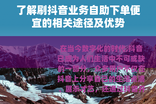 在当今数字化的时代,抖音已成为人们生活中不可或缺的一部分,众多用户不仅在抖音上分享自己的生活点滴、展示才艺,还通过抖音开展各种商业活动,而刷抖音业务自助下单便宜的服务也应运而生,为许多用户提供了便利和价值。