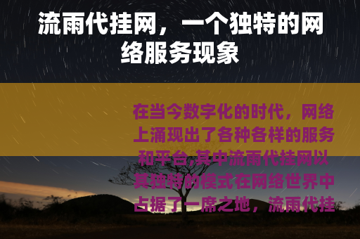 在当今数字化的时代,网络上涌现出了各种各样的服务和平台,其中流雨代挂网以其独特的模式在网络世界中占据了一席之地。