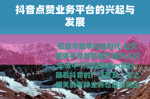 在当今数字化的时代,社交媒体平台如抖音已成为人们生活中不可或缺的一部分,随着抖音的广泛普及,与之相关的各种业务也应运而生,其中抖音点赞业务平台就是备受关注的一种。