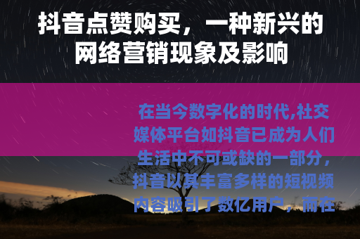 在当今数字化的时代,社交媒体平台如抖音已成为人们生活中不可或缺的一部分,抖音以其丰富多样的短视频内容吸引了数亿用户,而在这个庞大的生态系统中,抖音点赞购买逐渐成为一种备受关注的现象。
