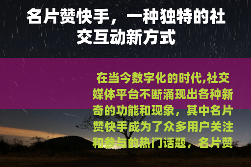 名片赞快手作为一种新兴的社交互动方式,在快手平台上发挥着重要的作用,它为用户提供了一个展示自己、结交朋友、提升人气的平台,同时也为平台的发展注入了新的活力,只要用户能够正确对待名片赞,充分发挥其积极作用,就能够在快手上收获更多的快乐和成长,让我们一起在名片赞快手的世界里,尽情展现自己的风采,享受社交的乐趣。
