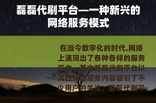 在当今数字化的时代,网络上涌现出了各种各样的服务平台,其中磊磊代刷平台以其独特的服务内容吸引了不少用户的关注,磊磊代刷平台是一个为用户提供特定数据代刷服务的网络平台,它在网络世界中逐渐崭露头角,为众多有需求的用户提供了一种别样的解决方案。