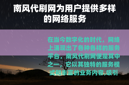 在当今数字化的时代,网络上涌现出了各种各样的服务平台,南风代刷网便是其中之一,它以其独特的服务模式和丰富的业务内容,吸引了众多用户的关注。