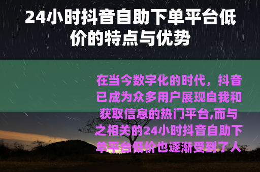 在当今数字化的时代,抖音已成为众多用户展现自我和获取信息的热门平台,而与之相关的24小时抖音自助下单平台低价也逐渐受到了人们的关注。