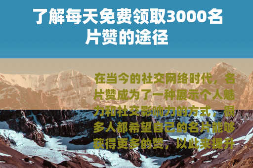 在当今的社交网络时代,名片赞成为了一种展示个人魅力和社交影响力的方式,很多人都希望自己的名片能够获得更多的赞,以此来提升自己在社交平台上的人气,而现在,有一种途径可以让你每天免费领取3000名片赞,这无疑为那些渴望增加赞数的用户带来了福音。
