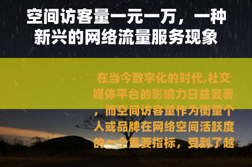 在当今数字化的时代,社交媒体平台的影响力日益显著,而空间访客量作为衡量个人或品牌在网络空间活跃度的一个重要指标,受到了越来越多人的关注,一种声称空间访客量一元一万的服务悄然兴起,引发了众多网民的兴趣和讨论。