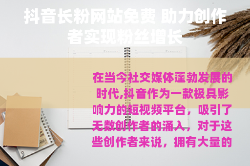 在当今社交媒体蓬勃发展的时代,抖音作为一款极具影响力的短视频平台,吸引了无数创作者的涌入,对于这些创作者来说,拥有大量的粉丝是实现自身价值和影响力的重要途径之一,而抖音长粉网站免费的出现,为他们提供了一个新的机会和助力。